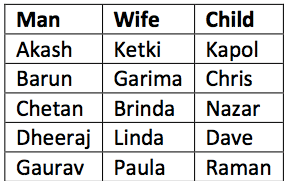 Akash, Barun, Chetan, Dheeraj and Gaurav are married to Paula, Brinda, Linda, Garima and Ketki, not necessarily in this order. All these couples have a child each. The names of the five children are Kapol, Dave, Chris, Raman and Nazar, in no particular order.